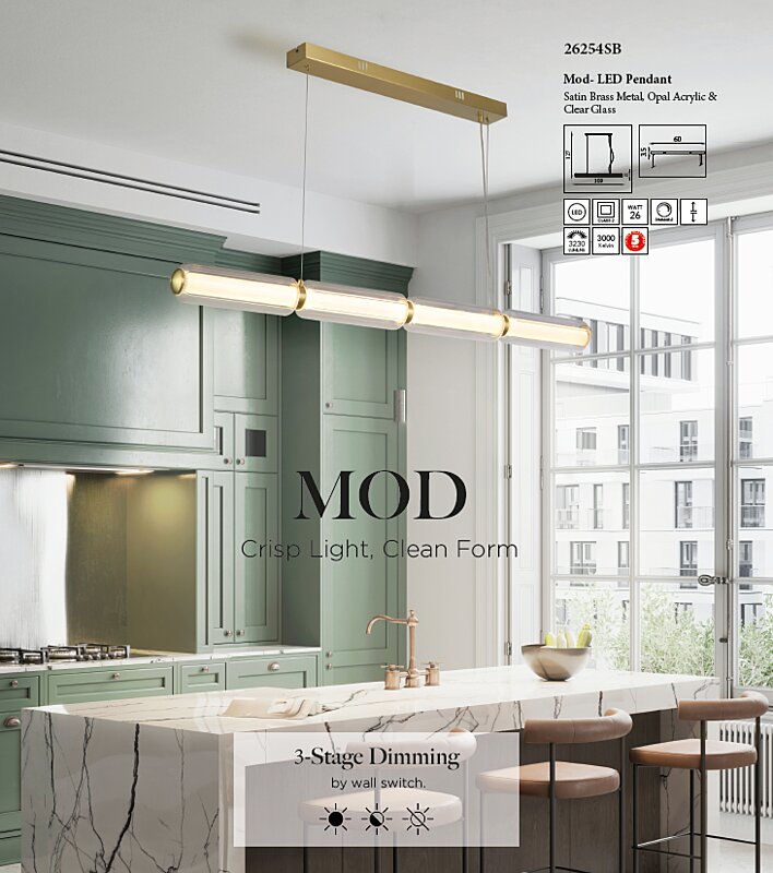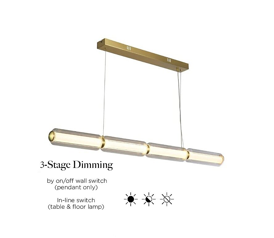 Moderní lustr od anglického výrobce Searchlight je vyrobený z kovové montury v matné zlaté barvě. Stínidla jsou vyrobená z čirého skla a matného opálového akrylu. Velkou výhodou je možnost stmívání světla, nic dalšího nepotřebujete. Světlo je vybavené třístupňovým stmívaním, svítíte na 100%, 50% nebo světlo vypnete. Výšku závěsu lze libovolně zkrátit. Světlo svítí 26W příjemnou, teplou bílou barvou, 3000K. Kombinujte s osvětlením ve shodné sérii.