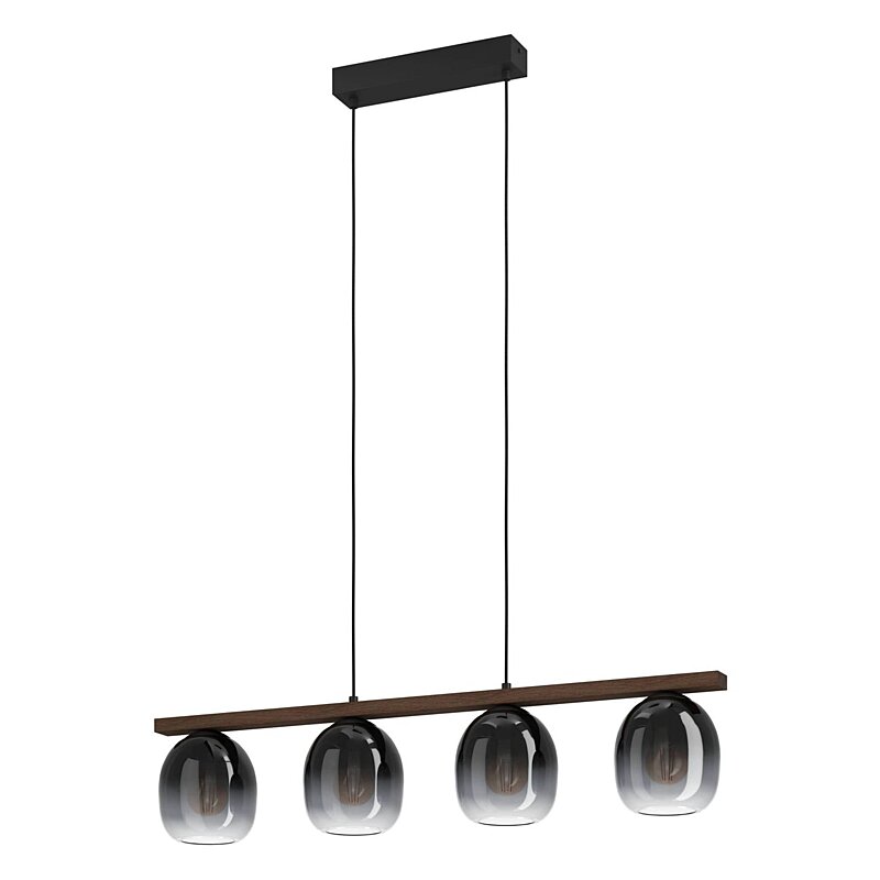 kompatibilní závit(patice) E27Moderní závěsné svítidlo je vyrobeno ze dřeva a kovu se skleněnými stínidly. Světlo je opsazeno čtyřmi paticemi E27 a je nutné jej doplnit vhodnými žárovkami. Výška svítidla je nastavitelná dle potřeby. Záruka na svítidlo je v délce 2 roky. Barva materiálu svítidla je černá; hnědá. Součástí balení není světelný zdroj