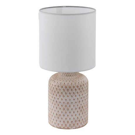 Stolní lampička z řady BELLARIVA vybavena paticí E14 o maximálním výkonu 40W a kabelovým přepínačem umístěném na přívodním kabelu pro snadné ovládání. Světelný zdroj není součástí balení. Lampička je vyrobena z keramiky, lakována do krémovo-bílé barvy. Stínidlo je vyrobeno z bílé látky. Váha lampičky je 0,73kg, hodnota stupně krytí je IP20.