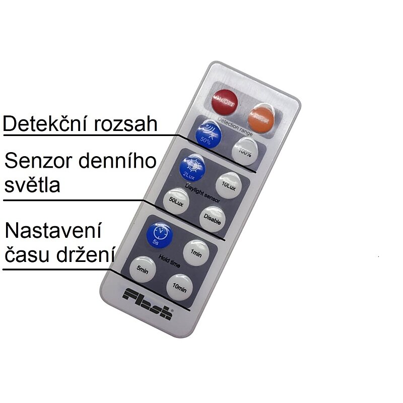 Detekční oblast lze zmenšit na 50 %, ostatní úrovně denního světla jsou 2 lx, 10 lx nebo deaktivovat a čas držení může být 5 s, 5 minut nebo 10 minut.