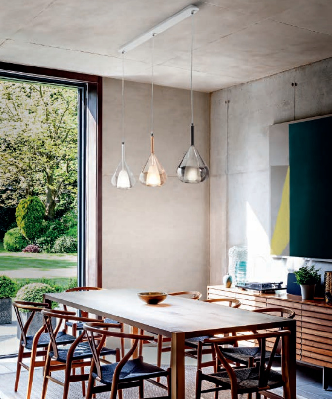 Krásné světlo od italského výrobce Fabas Vás zaujme svým designem. Lustr má bílý kovový rám a tři borosilikátová skla v moderních barvách zlaté, kouřově šedé a čiré. Podstavec světla je 83cm dlouhý a 8cm hluboký. Výška závěsu je maximálně 2 metry a lze jí libovolně zkrátit. Skleněná stínidla jsou vysoká 35cm a v průměru mají 20cm. Skvělá volba. Kombinujte s osvětlením v sérii Lila.