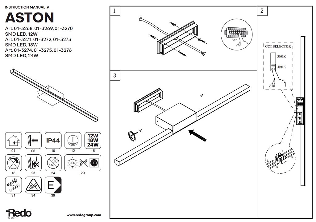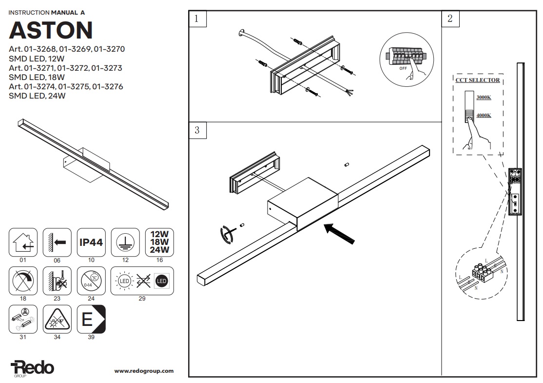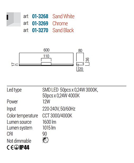 Interiérové, nástěnné světlo Aston 01-3269 s možností volby teploty barvy světla. Světlo je chráněné proti vlhkosti, má krytí IP44. Na výběr máte mezi 3000K nebo 4000K, přepínač je umístěný na základně světla, barvu světla si vyberete před instalací. Kovové a hliníková konstrukce je elektrostaticky lakovaná v stříbrném provedení. Difuzor je opálový, silikonový.