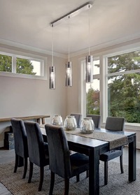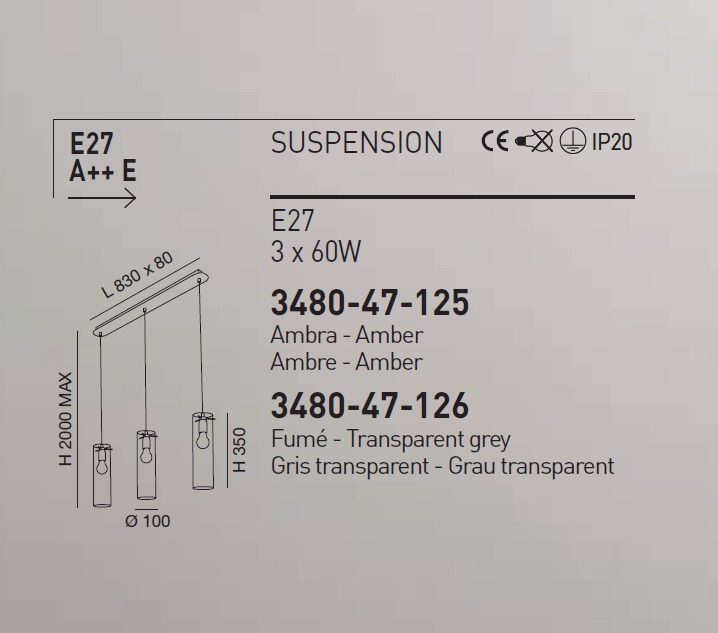 Krásné světlo od italského výrobce Fabas je vyrobeno z foukaného skla v transparentní kouřové barvě. Výška závěsu je 2m a lze jí libovolně zkrátit. Kovový rám je vyroben z saténového niklu. Tři stínidla jsou zavěšná na liště 83cm dlouhé. Stínidlo má v průměru 10cm a je dlouhé 35cm.
