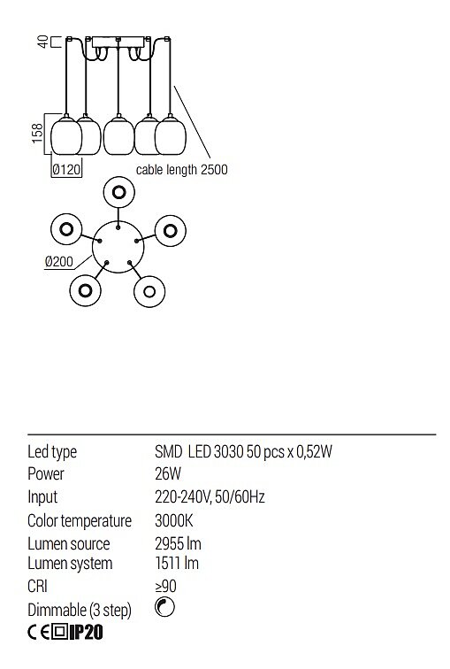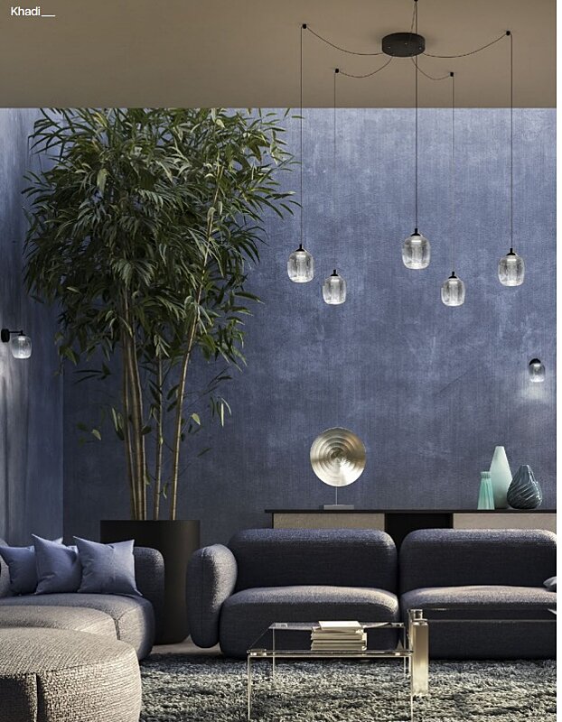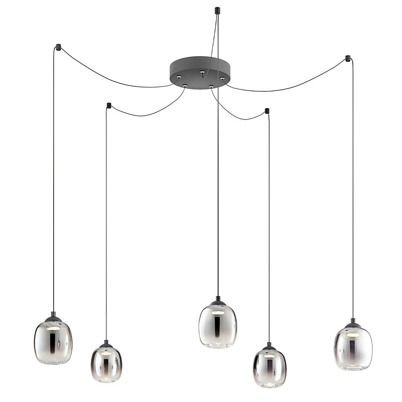 Krokově stmívatelné světlo 01-3487 Khadi je vyrobené z kovové základny, lakované v tmavě černé, matné barvě. Délka kabelů je 2,5m a lze je libovolně zkrátit a zavěsit kam potřebujete. Pět kusů stínidel je vyrobeno z kouřového skla, stinidlo má v průměru 12cm a vysoké je 15,8cm. Použité SMD LEDKy svítí 26W teplou bílou barvou 3000K. Díky krokovému stmívání můžete svítit na plný výkon, poloviční výkon nebo třetinový.