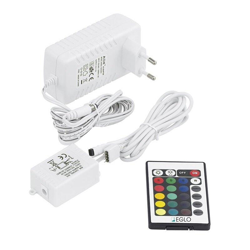 Sada obsahuje napájecí zdroj, 1 LED pásek o délce 2 m, dálkový ovladač a řídící jednotku