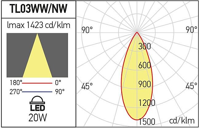 LED spot vybaven SMD 2835 runline diodou o výkonu 20W vyroben z plastu v černé barvě. Reflektor je možno otáček kolem své osy o 350° a naklápět o 90° vertikálně. Pro realizaci kontinuálních světelných konstrukcí můžete použít konektor, rohovou spojku, "T" spojku, křížovou spojku, koncovku, nebo lišty ze série TRACK N. Vybaveno tříokruhovým kolejovým konektorem, 250V, 16A, popř lze namontovat přímo na strop přes základovou desku TKN1016. UGR<19.