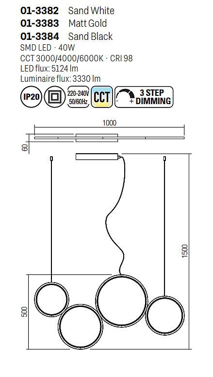 Moderní světlo Athena je vyrábeno z hliníku v matném, bílém provedení. Výhodou svítidla 01-3382 Athena je funkce krokového stmívání, nepotřebujete žádný další stmívač. Světlo stmíváte ve třech fázích Vaším nástěnným vypínčem. Svítíte buď plným výkonem, polovičním nebo třetinovým. Ke stmívání dochází zapnutím a vypnutím vypínače do tří vteřin. Pokud stmívat nechcete, světlo jen zhasnete nebo rozsvítíte. Svítidlo je osazeno kvalitními LEDkami s příkonem 40W. Teplota chromatičnosti je 3000; 4000; 6000K, barvu světla si vyberete přepnutím vypínače na základně při instalaci. Výšku závěsu si lze libovolně zkrátit.
