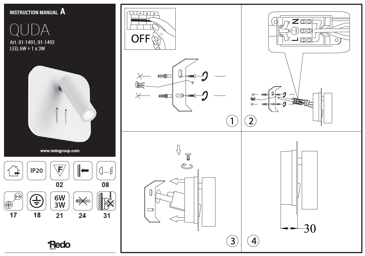 Nástěnné LED interiérové svítidlo vybaveno 30 EDISON SMD LED 2835 diodami o celkovém výkonu 6W a jednou CREE POWER LED diodou o výkonu 3W . Konstrukce je vyrobena z hliníku, lakována do bílé barvy. Difuzor je vyroben ze saténového polykarbonátu. Světlo má dva přepínači pro ovládání bočního, nebo hlavního osvětlení. Hodnota stupně krytí je IP20, hodnota CRI 85. Svítidlo není možno stmívat.