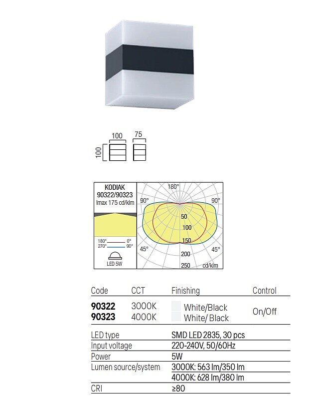 Venkovní LEDkové světlo svítí teplou bílou barvou 5W, použité LEDky SMD LED 2835, 30 pcs x 0,16W 3000K. Světlo je určené pro instalaci na stěnu. Tato varianta 90322 je nejmenší v této sérii, 10x10cm. Kombinujte s osvětlením ve shodné sérii. Barvu světla 2700K nebo 3000K si vyberete před instalací svítidla, přepínačem na montuře.