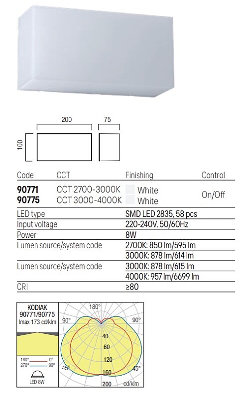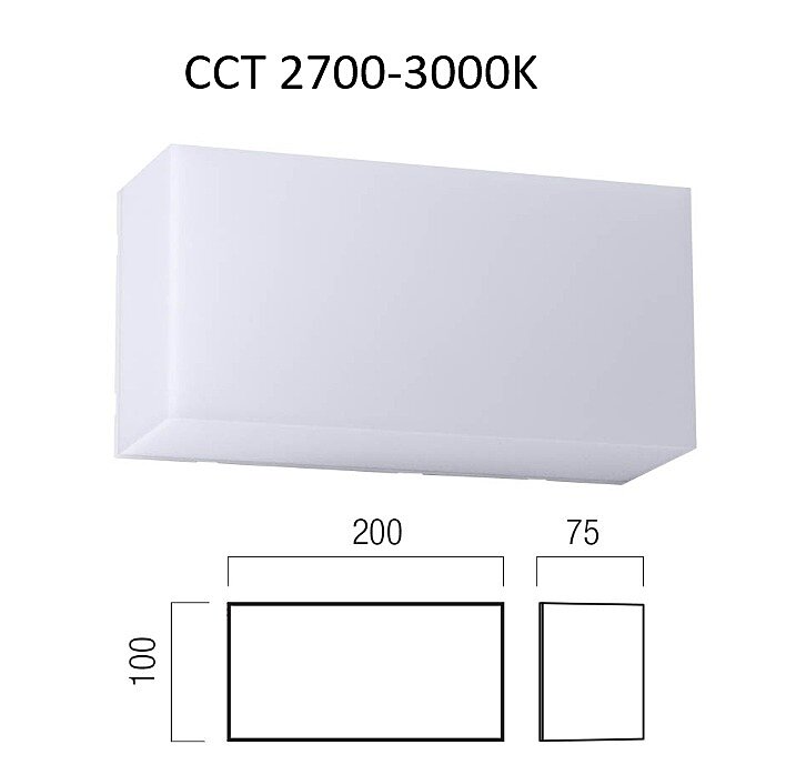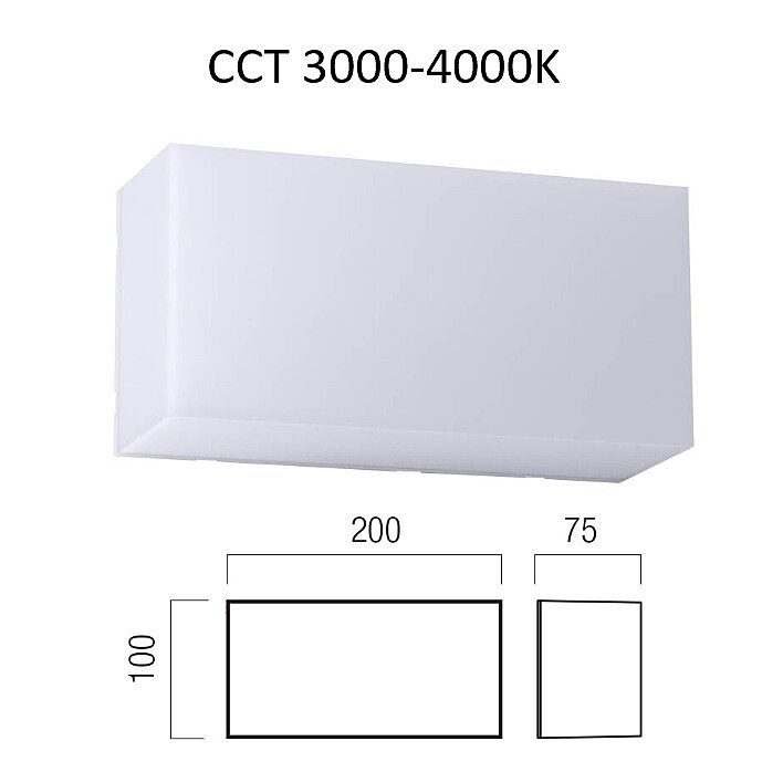 Venkovní LEDkové světlo svítí teplou bílou barvou 8W, použité LEDky SMD LED 2835 58 ks x 0,13W 2700K + 58 ks x 0,13W 3000K. Světlo je určené pro instalaci na stěnu nebo strop. Tato varianta 90775 je obdélníkového tavru 20x10cm. Kombinujte s osvětlením ve shodné sérii. Barvu světla 3000K nebo 4000K si vyberete před instalací svítidla, přepínačem na montuře.