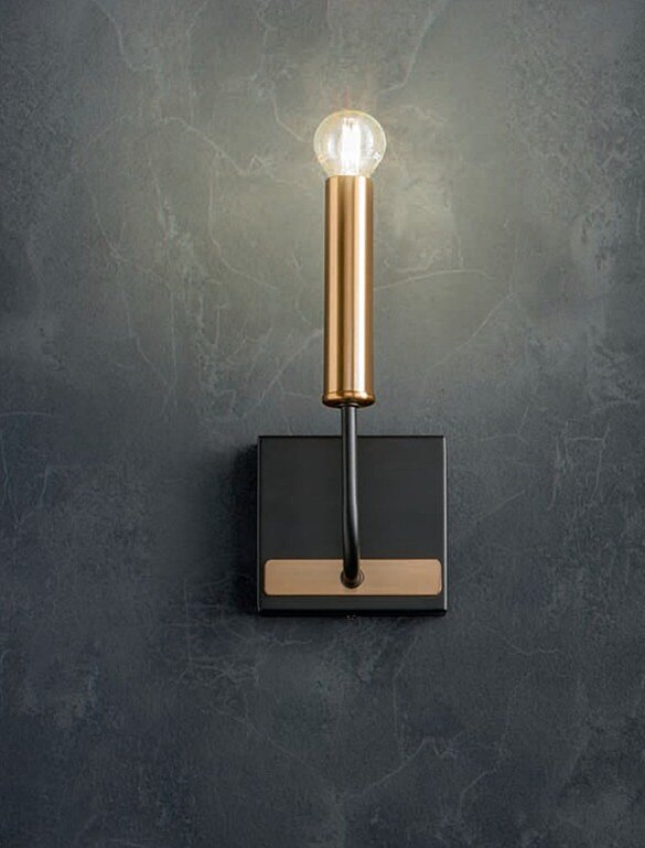 Interiérové nástěnné svítidlo s paticí E14 o max. výkonu 28W. Konstrukce je vyrobena z kovu lakovaná do matné černé barvy a starožitné mosazy. Ke svítidlu se skvěle hodí Vintage žárovky.