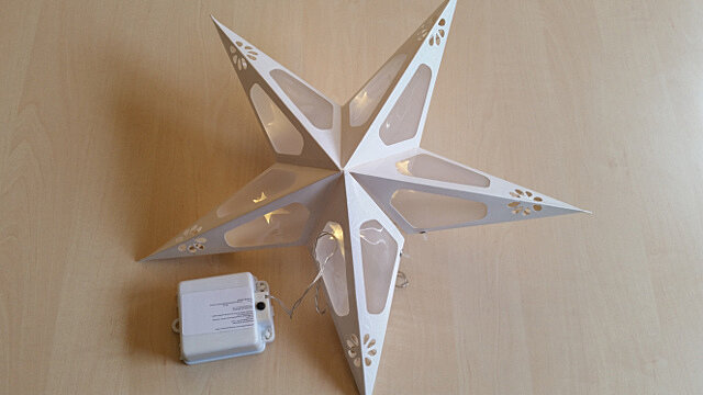 Papírová hvězda je vyrobená v bílé barvě. Napájíte ji pomocí dvou baterií D, které si vyberete podle vlastního uvážení. Díky tomu si hvězdu dáte, kam se vám zlíbí.