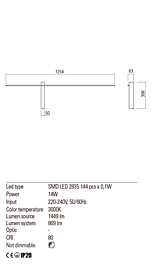 Interiérové nástěnné svítidlo vybaveno 144 SMD LED 2835 diodami o příkonu 0,1W. Konstrukce je vyrobena z hliníku, elektrostaticky lakována do pískované bílé barvy. Difuzor je vyroben z opálového silikonu. Hodnota stupně krytí je IP20. Svítidlo není možno stmívat.