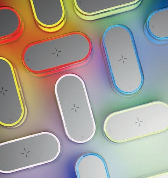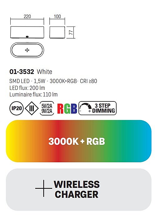 Vnitřní stolní lampa s bezdrátovou nabíječkou, vybavená SMD LED diodami, dotykovým vypínačem ON/OFF a stmívačem (dotykový senzor), dotykovým stmívačem 100% - 60% - 30% s pamětí intenzity světla a běžícím RGB operačním programem. Vybavena Li-Ion baterií 602040, kapacita 400 mA, ochrana proti přepětí, port USB typu C pro nabíjení a napájecím kabelem (součástí balení). Maximální doba nabíjení 2 hodiny, doba provozu (při plném nabití) 2,5 hodiny. Bílé ABS tělo, opálově bílý sítotiskový průhledný polypropylenový difuzor. Tento produkt je kompatibilní se všemi mobilními zařízeními, která splňují standard bezdrátového nabíjení QI (bezdrátový přenos energie probíhá magnetickou indukcí). Bezdrátová nabíječka podporuje nabíjení 5W/7,5W/10W/15W při použití standardního adaptéru QC2.0/3.0 (není součástí balení).