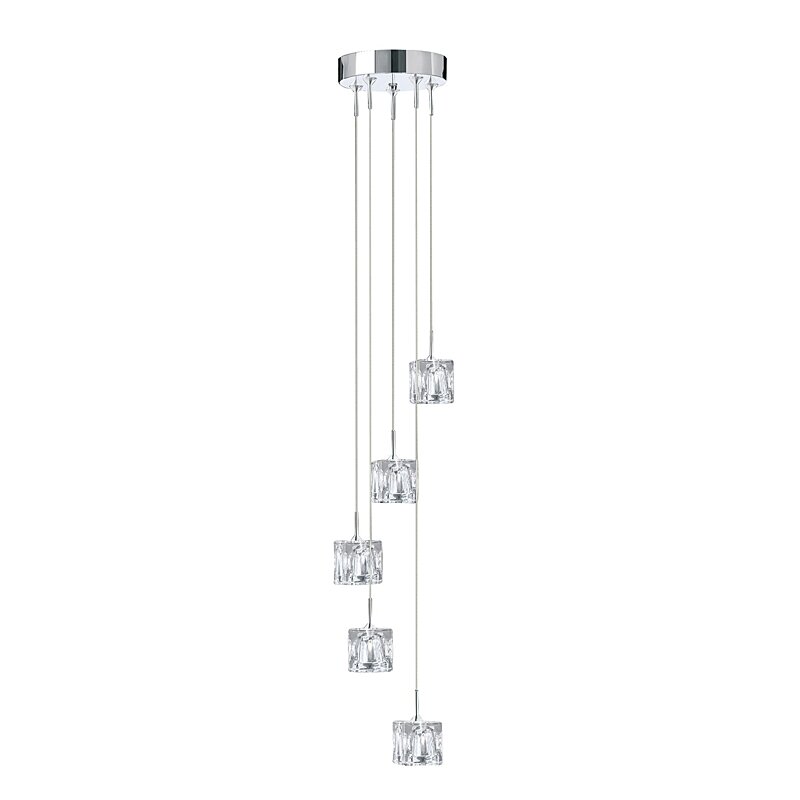 Závěsné LED svítidlo z řady Ice Cube vybaveno pěti LED moduly o výkonu 5x5W. Svítidlo je vyrobeno z kovu, lakováno do chromové barvy. Difuzor je vyroben z čirého skla. Délku závěsu je možno libovolně zkrátit. Hodnota stupně krytí je IP20, hmotnost svítidla 2,7kg.