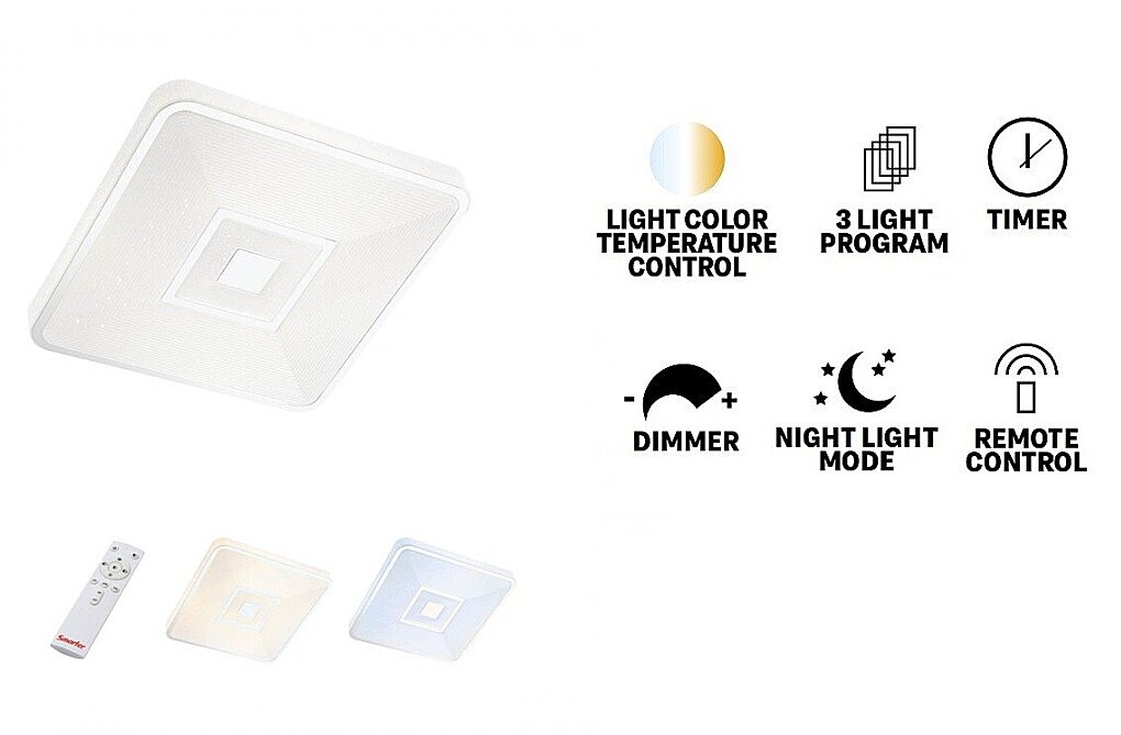 Interiérové stropní svítidlo Apollo 05-948 je vybavené 24W SMD LED diodami. Kovová konstrukce je lakovaná matnou, bílou barvou, difuzor je vyroben ze vzorovaného bílého akrylu se třpytivým efektem a chromovanými ornamenty. Světo je dodáváno s dálkovým ovladačem (2 AAA baterie jsou součástí balení) s více funkcemi: ON/OFF, 3 provozní programy, regulace intenzity světla, změna teploty barev od teplé bílé po studenou bílou a režim nočního světla.