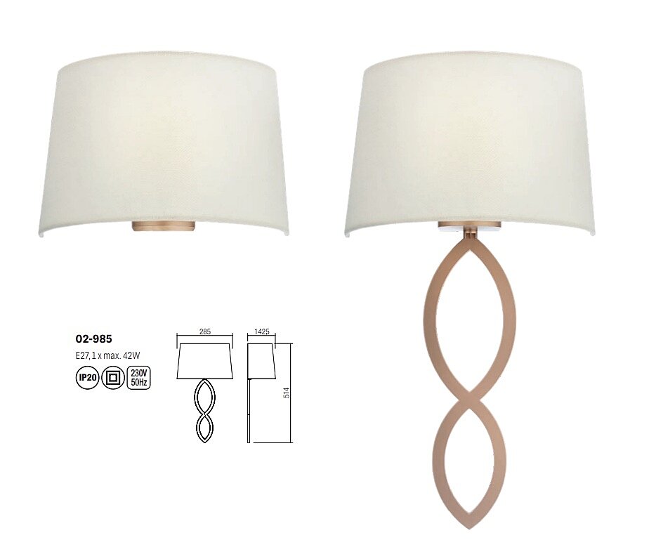 kompatibilní závit(patice) E27Nástěnné vnitřní svítidlo Sidra 02-985 je vyrobené z plastové konstrukce s matně zlatou povrchovou úpravou, béžové stínidlo s kovovou konstrukcí, textilní materiál spojený s PVC. Svítidlo je možné instalovat bez spodního dílu ve tvaru osmičky.