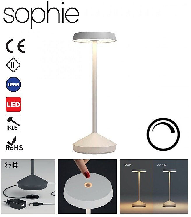 LED lampička s dotykovým vypínačem ON/OFF. Lampičku je možné plynule stmívat 100%-5%, měnit barvu světla 2700K a 3000K a velkou výhodou je paměť jasu. Lampička je vybavená litium-ionovou baterií 18650, kapacitou 2.200mA x 2, systémem proti přetížení. Součástí dodávky je zásuvka micro USB pro nabíjení lampičky. Lampičku nabíjíte pro plné nabití 6 hodin, poté odpojíte, nejste limitování délkou kabelu, odnesete kam potřebujete a svítíte po plném nabití přibližně 9 hodin. Lampička je vyrobena z hliníku lakovaného bílou, matnou barvou. Difuzor je z polykarbonátu.