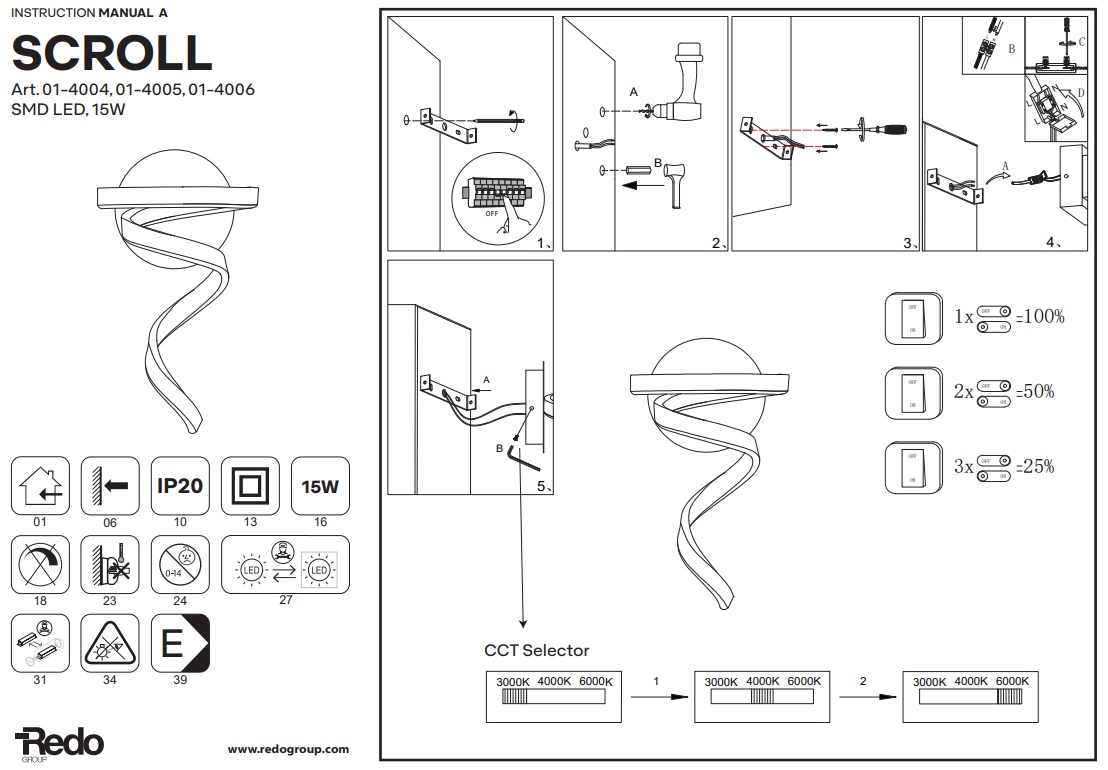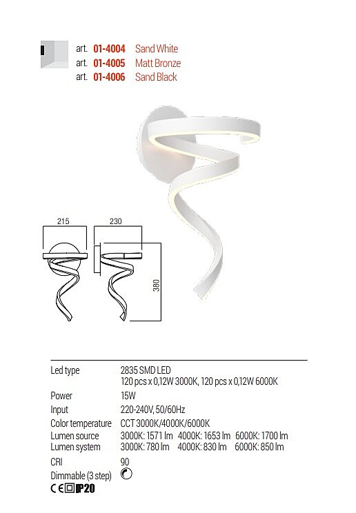 Moderní světlo Scroll 01-4005 je vyrobené v matné bronzové barvě. Barvu světla lze měnit před instalací. Vyberete si tu, co Vám bude nejvíce vyhovovat a zvolíte si jí přepínačem na základně. Na výběr máte 3000K teplou bílou, 4000K denní bílou a 6000K studenou bílou. Nástěnku lze také krokově stmívat. Stmíváte světlo překliknutím vypínače, svítíte na 100%, 50% nebo 25%. Stmívač je součástí světla, nic dalšího nepotřebujete. Skvělá a jednoduchá volba stmívání. Kombinujte s osvětlením ve shodné sérii.