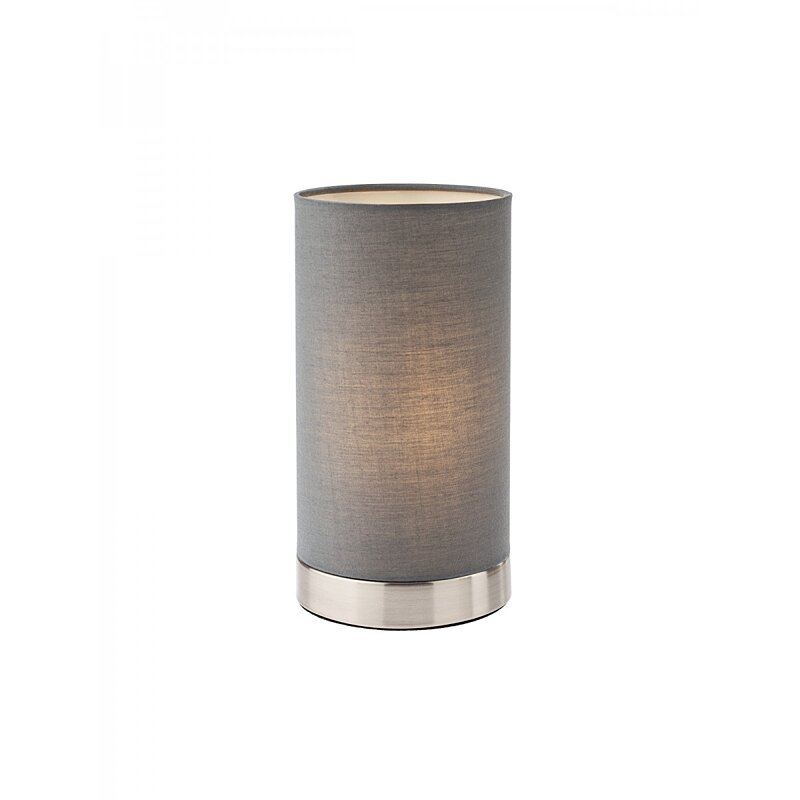 kompatibilní závit(patice) E14Stolní lampička je určena pro použití do interiéru. Podstavec má strukturu saténově niklového kovu. Stínidlo má šedou barvu. Látkové stínidlo je na bílém PVC podkladu. Délka kabelu je 1,5m a vypínač je umístěný 30cm od lampičky.