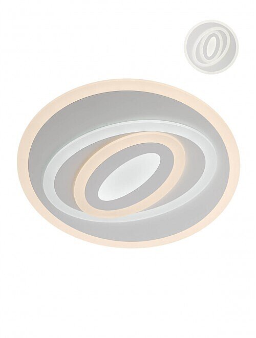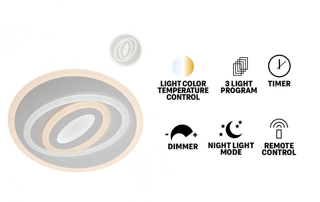 Interiérové stropní LED svítidlo, které je vybaveno 650 SMD LED diodami o příkonu 0,1W. Konstrukce je vyrobena z kovu, lakována do matné bílé barvy. Difuzor je vyroben ze saténového akrylu. V balení je dodáván dálkový ovladač díky, kterému můžete měnit režimy, intenzitu osvětlení, změnu chromatičnosti, režim časovače a nočního světla. Hodnota stupně krytí je IP20.