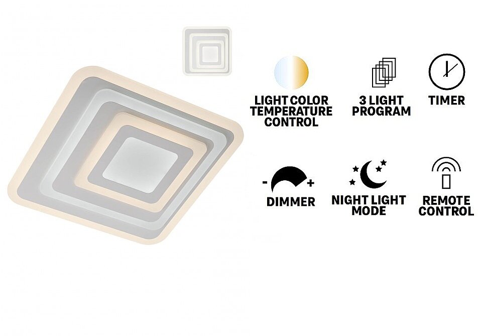 Interiérové stropní LED svítidlo, které je vybaveno 820 SMD LED diodami o příkonu 0,1W. Konstrukce je vyrobena z kovu, lakována do matné bílé barvy. Difuzor je vyroben ze saténového akrylu. V balení je dodáván dálkový ovladač díky, kterému můžete měnit režimy, intenzitu osvětlení, změnu chromatičnosti, režim časovače a nočního světla. Hodnota stupně krytí je IP20.