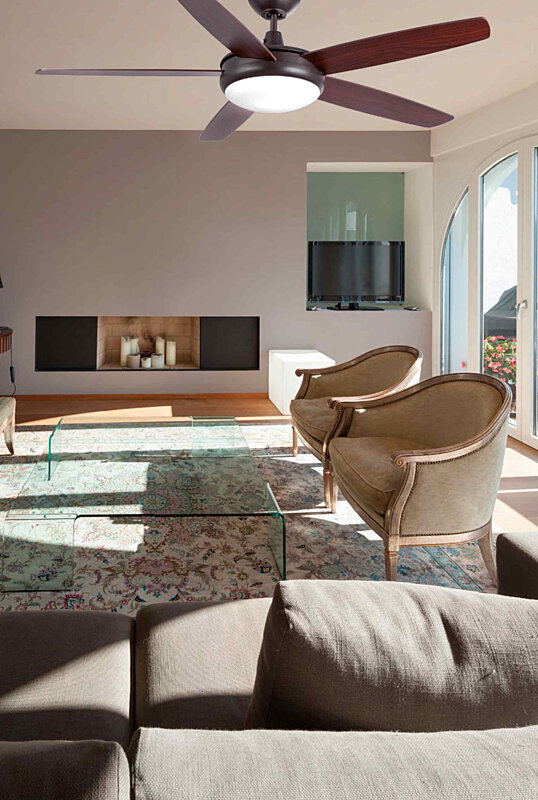 Reverzní lopatky a přepínač zpětného chodu na těle ventilátoru zajistí využití i v zimě, kdy tlačením teplého vzduchu od stropu dolů zefektivňuje rozptýlení tepla v místnosti a snižuje tak výdaje za topení až o 20%.