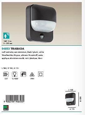kompatibilní závit(patice) E27Nástěnné venkovní svítidlo TRABADA si posvítí na vaší terasu, zahradu, případně na souseda. Svítidlo se vyrábí z oceli a stínidlo ze skla.