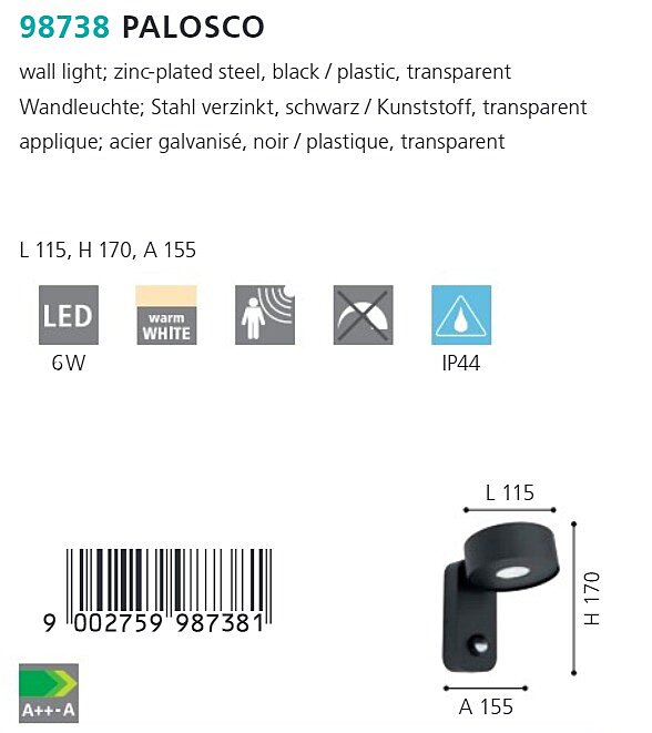 Nástěnné světlo s čidlem má rozsah 90°, dosah 6 metrů. Časový rozsah je od 10 vteřin do 12 minut. Venkovní LED světlo svítí teplou bílou barvou, 6W. Kombinujte s osvětlením ve shodné sérii.