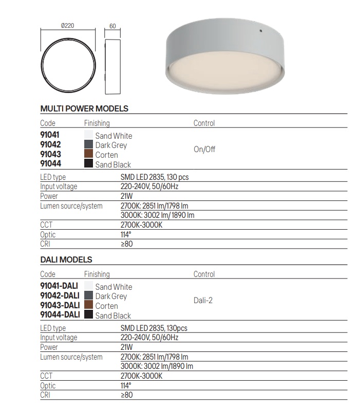 Stropní světlo Nox 91042 je určeno pro instalaci do venkovního prostředí. Základna je vyrobená z kovu odlitého pod tlakem s ochranou proti korozi. Základna je elektrostaticky lakovaná v matné, tmavěšedé barvě. Světlo svítí teplou barvou, na výběr máte 2700K nebo 3000K. Barvu si zvolíte při instalaci svítidla, přepínačem zvolíte co Vám bude vyhovovat. Světla jsou dostupní i v stmívatelné verzi Dali.