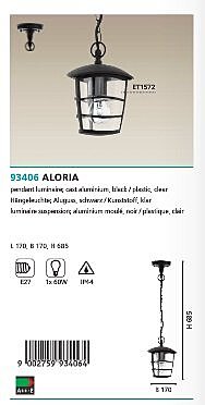 kompatibilní závit(patice) E27Venkovní závěsné svítidlo řady Aloria je vyrobeno z hliníkové slitiny a umělé hmoty. Závěs svítidla má zpracování řetězu na jehož konci se nachází stínidlo, které svým designem připomíná lucerničku.