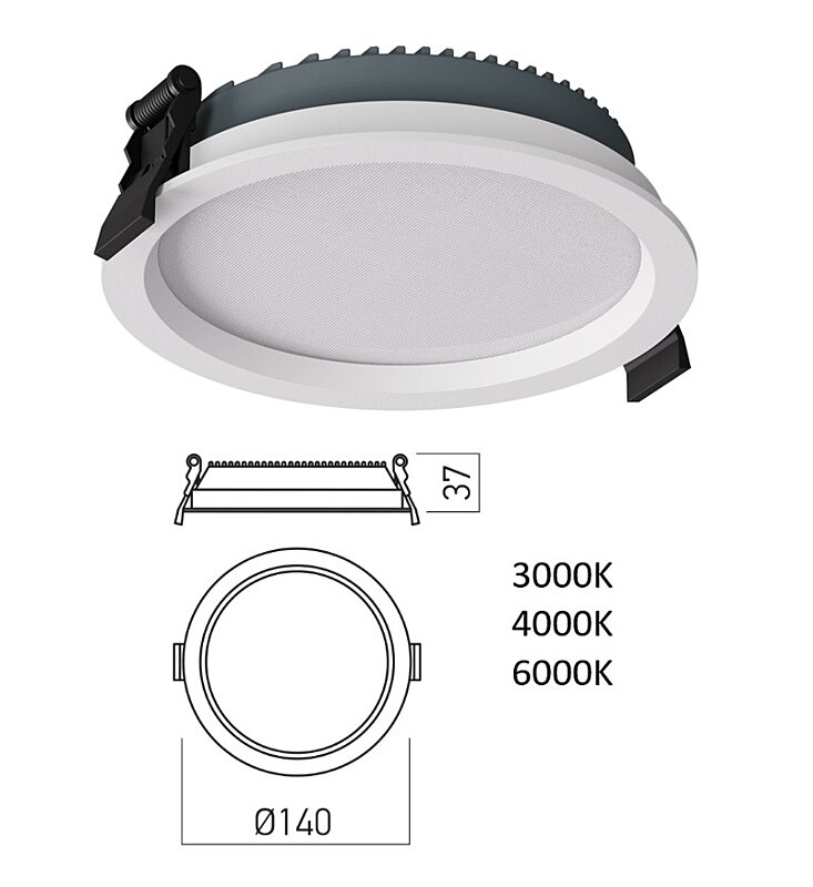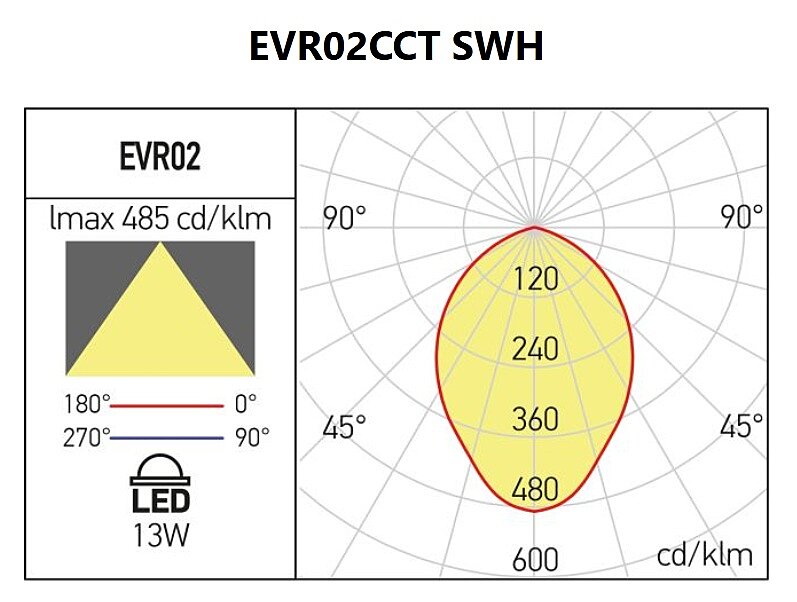 Vestavné LED světlo Xevo CCT EVR02CCT SWH svítí 13W, 1804/1910/1920lm. Kulatý rám je vyroben z tlakově litého hliníku, elektrostaticky lakovaný s pískovanou povrchovou úpravou. Pouzdro z tlakově litého eloxovaného hliníku sloužící jako chladič pro LED moduly. Dvojitý polystyrenový difuzor, první opálově saténový, druhý prizmatický. LED driver s konstantním proudem je dodáván se svítidlem. Velkou výhodou je přepínač teploty chromatičnosti připojený mezi svítidlo a výstup driveru. Můžete si navolit barvu světla dle potřeby, na výběr máte 3000K, teplou bílou nebo 4000K denní bílou a nebo 6000K studenou bílou barvou.