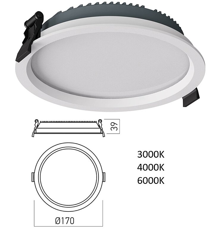 Vestavné LED světlo Xevo CCT EVR03CCT SWH svítí 23W, 1998/2097/2107lm. Kulatý rám je vyroben z tlakově litého hliníku, elektrostaticky lakovaný s pískovanou povrchovou úpravou. Pouzdro z tlakově litého eloxovaného hliníku sloužící jako chladič pro LED moduly. Dvojitý polystyrenový difuzor, první opálově saténový, druhý prizmatický. LED driver s konstantním proudem je dodáván se svítidlem. Velkou výhodou je přepínač teploty chromatičnosti připojený mezi svítidlo a výstup driveru. Můžete si navolit barvu světla dle potřeby, na výběr máte 3000K, teplou bílou nebo 4000K denní bílou a nebo 6000K studenou bílou barvou.