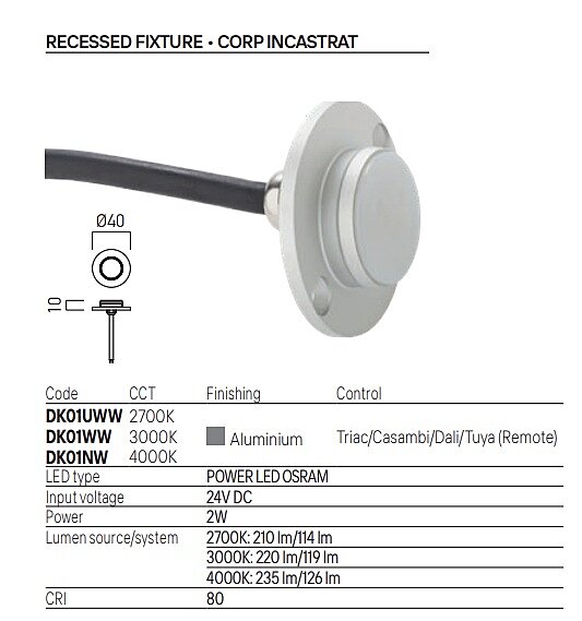 Zápustné exteriérové LED svítidlo z řady XDECK vybaveno POWER LED OSRAM diodou o výkonu 2W a s krytím IP67. Ke svítidlu je nutno dokoupit podle počtu svítidel vhodný 24V DC napájecí zdroj. Můžete si dokoupit také set dálkového ovladače se stmívačem, pro stmívání svítidla, nebo dekorativní rámeček, který Vám upraví světelný tok. Celé svítidlo je vyrobeno z eloxovaného hliníku se silikonovým bočním kroužkem pro upevnění dekorativního rámečku. Difuzér je vyroben z opálového plexiskla s disperzí 120°. Svítidlo je vhodné pro vnitřní a venkovní dekorativní osvětlení, zejména značení přístupových cest a dopravních ploch. Hodnota CRI je 80, váha 0,07kg.