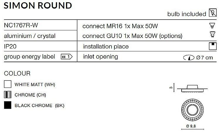 Zápustné svítidlo vhodné do interiéru vybaveno paticí GU10 o maximálním výkonu 50W. Konstrukce je vyrobena z hliníku a křišťálků, lakována do chromově černé barvy. Hodnota stupně krytí je IP20, světelný zdroj není součástí balení.