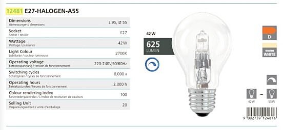 Žárovka má paticí E27 a svítí teplou bílou barvou o síle 42W. Životnost žárovky je 2000h a dále je stmívatelná. Index podání barev (CRI) je 100. celý popis >
