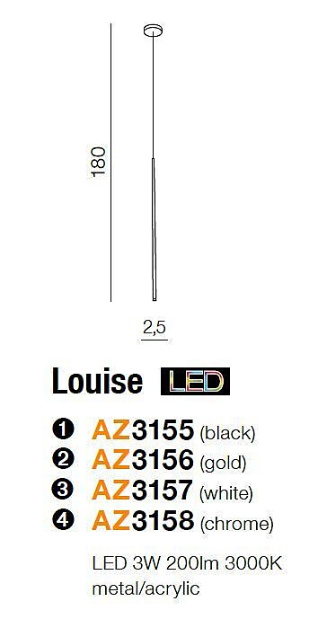 Interiérové LED svítidlo, které je vybaveno LED diodami o celkovém výkonu 3W. Délku závěsu je možno libovolně zkrátit. Konstrukce je vyrobena z kovu, lakována do chromové barvy. Difuzor je vyroben z akrylu. Hodnota stupně krytí je IP20.