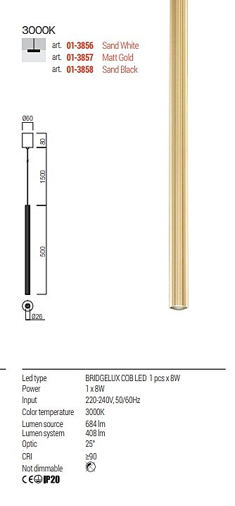 Závěsné světlo Nikos 01-3856 je vyrobené z kovu v matné, bílé barvě. Kov je jemně vroubkovaný a vytváří velmi hezký design stínidla. Světlo svítí 8W teplou bílou barvou, 3000K. Kombinujte s dalšími světly ze shodné série. Na výběr máte 35cm světla, 50cm světla a 75cm světla. Z barev lze zvolit matnou bílou, matnou zlatou a matnou černou. Kombinujte, bavte se. Zvolte si to pravé řešení do Vašeho interiéru.