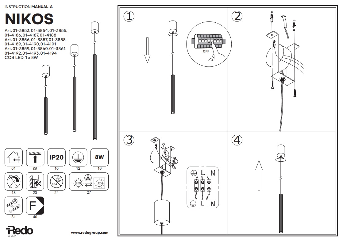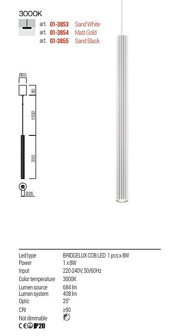 Závěsné světlo Nikos 01-3853 je vyrobené z kovu v matné, bílé barvě. Kov je jemně vroubkovaný a vytváří velmi hezký design stínidla. Světlo svítí 8W teplou bílou barvou, 3000K. Kombinujte s dalšími světly ze shodné série. Na výběr máte 35cm světla, 50cm světla a 75cm světla. Z barev lze zvolit matnou bílou, matnou zlatou a matnou černou. Kombinujte, bavte se. Zvolte si to pravé řešení do Vašeho interiéru.