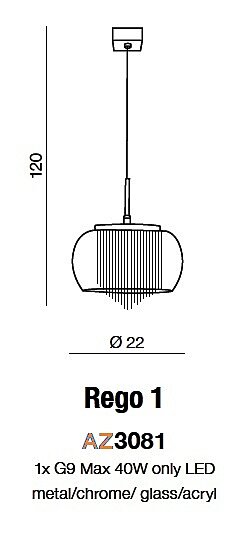 Interiérové svítidlo, ke kterému je potřeba dokoupit žárovku s paticí G9 o maximálním příkonu 40W. Světelný zdroj není součástí balení. Délku závěsu je možno libovolně zkrátit. Konstrukce je vyrobena z kovu, lakována do chromové barvy. Difuzor je vyroben z čirého skla. Okrasné závěsy jsou vyrobeny z čirého akrylu. Hodnota stupně krytí je IP20.